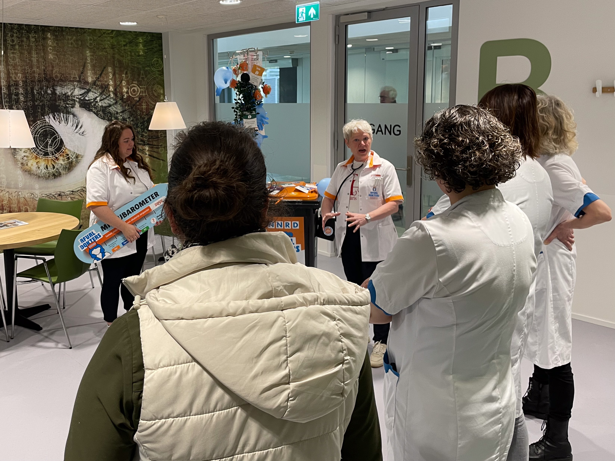 En dat is nodig, weet Weessies, bij NNRD accountmanager voor de zorg. „We proberen een beetje draagvlak te creëeren”, vertelt ze in de centrale hal voordat ze de afdelingen opgaan om daar met medewerkers te praten. „Heel veel mensen zijn wel betrokken hierbij maar ze weten ook vaak niet zo goed wat ze kunnen doen.”