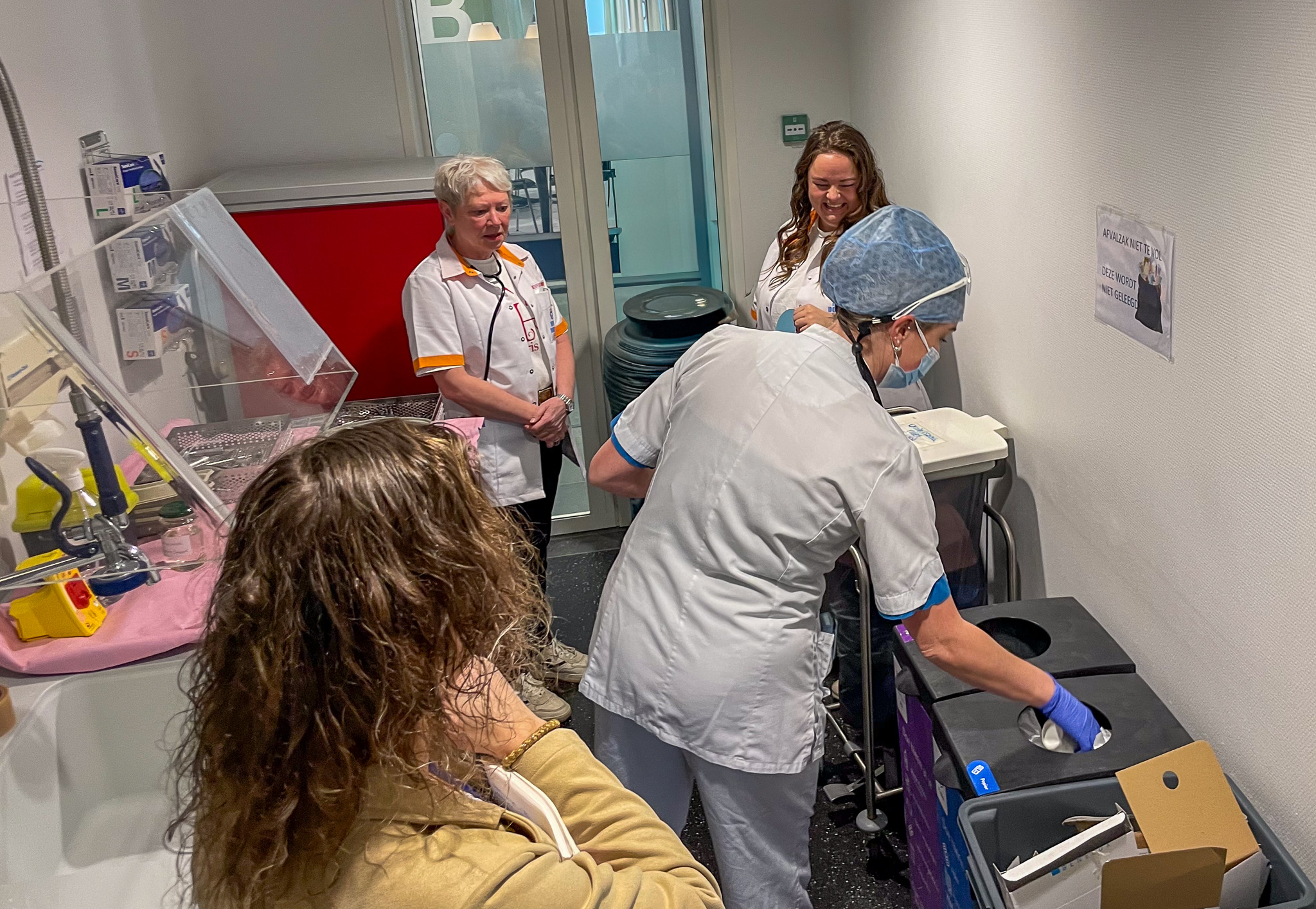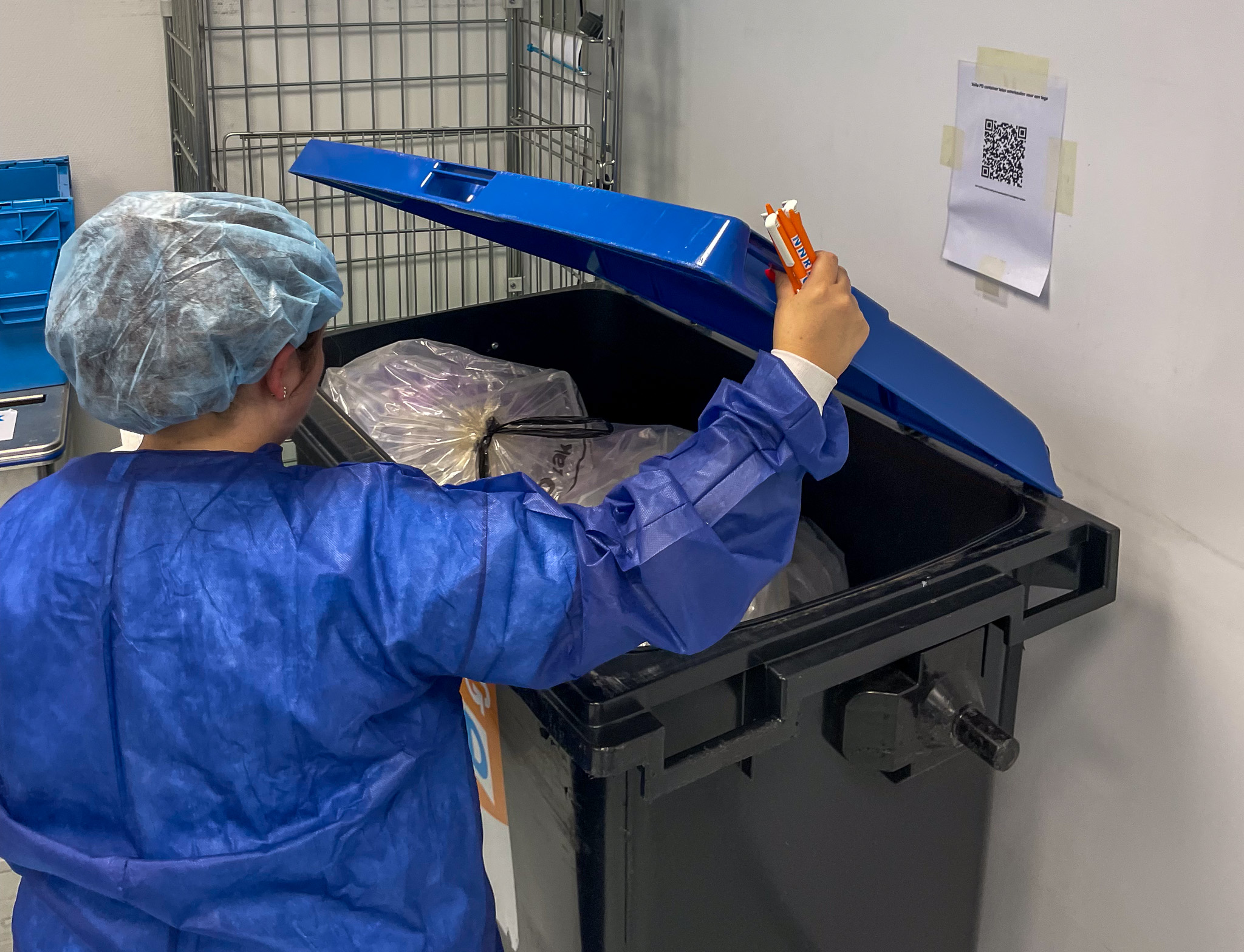 Hetzelfde geldt voor de handschoentjes, „dat is latex en kunnen we niks mee”, en de infuuszakken, „dubbele lagen pvc die we ook niet uit elkaar krijgen”. De papieren handdoekjes die massaal gebruikt worden om de handen af te drogen, mogen dan weer wel in de papierbak. „Die verdwijnen heel vaak bij het restafval. Dus dat is winst als die op de goede plek komen.”