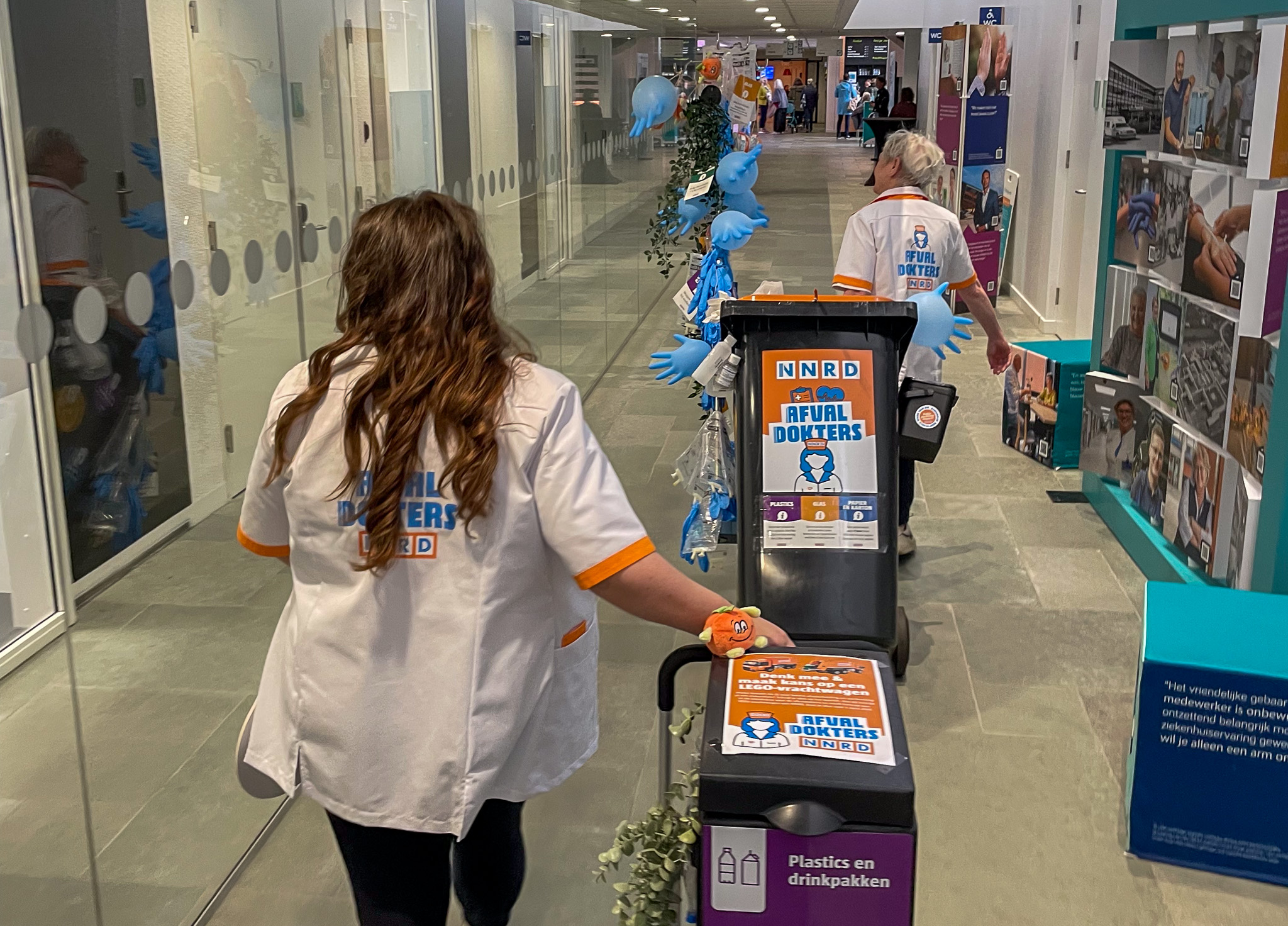 Weessies en Schiphof zijn in het ziekenhuis om op een ludieke manier aandacht te vragen voor afvalscheiding en het personeel uit te nodigen daarover mee te denken over waar kansen liggen. De twee werken bij afvalverwerker NNRD in Drachten die in het Noorden veel zorginstellingen als klant heeft. Het bedrijf probeert elk jaar iets ludieks te doen in de week van de circulaire economie om zo weer even de aandacht op het onderwerp te vestigen.