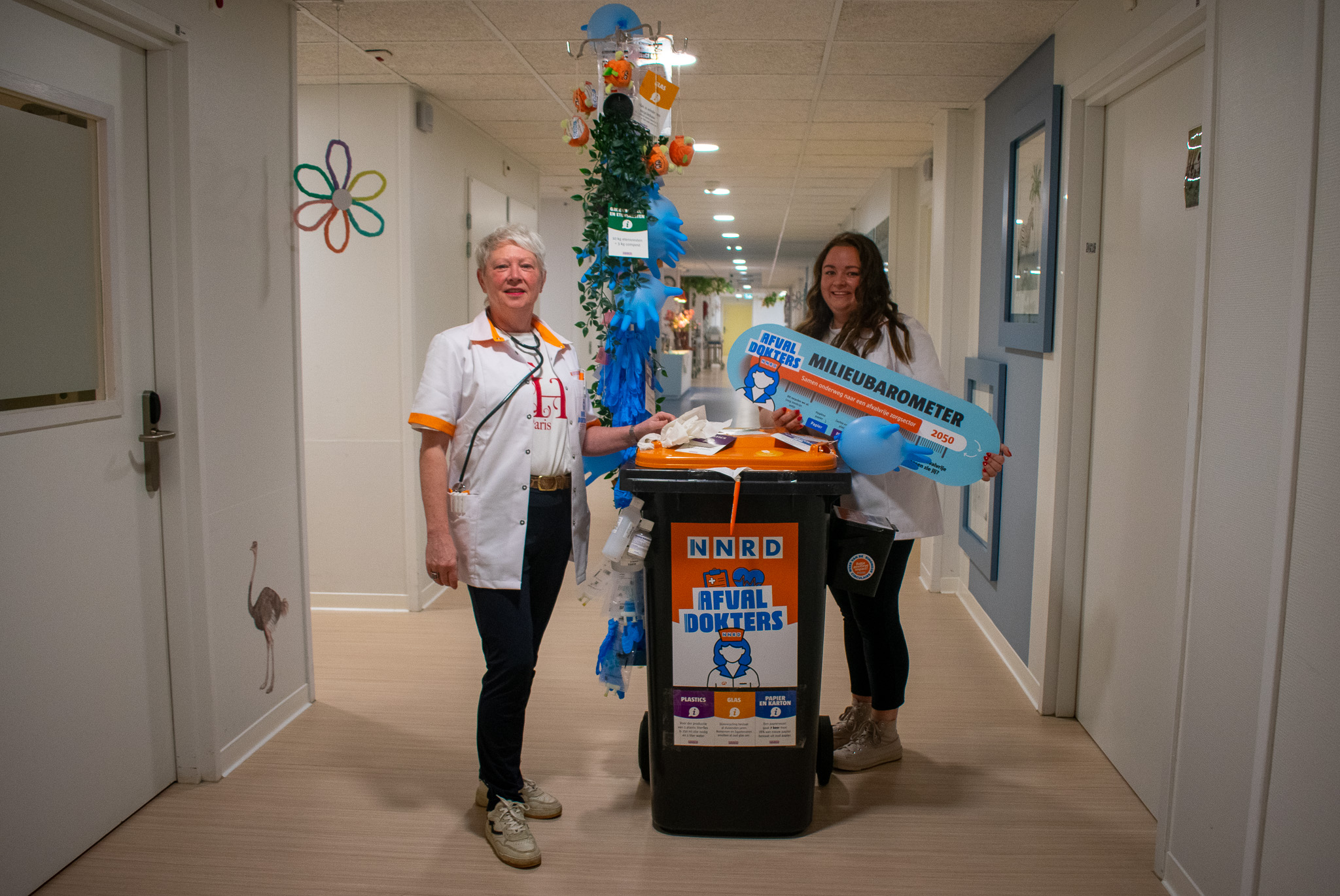 Ze zijn een opvallende verschijning in de hal van ziekenhuis Frisius MC in Leeuwarden: Marijke Weessies en Wally Schiphof. Uitgedost in doktersjassen duwen ze een container voor zich uit die is versierd met stickers, opgeblazen handschoentjes en lege infuuszakken. Bij de patiënten en medewerkers trekken ze het nodige bekijks.